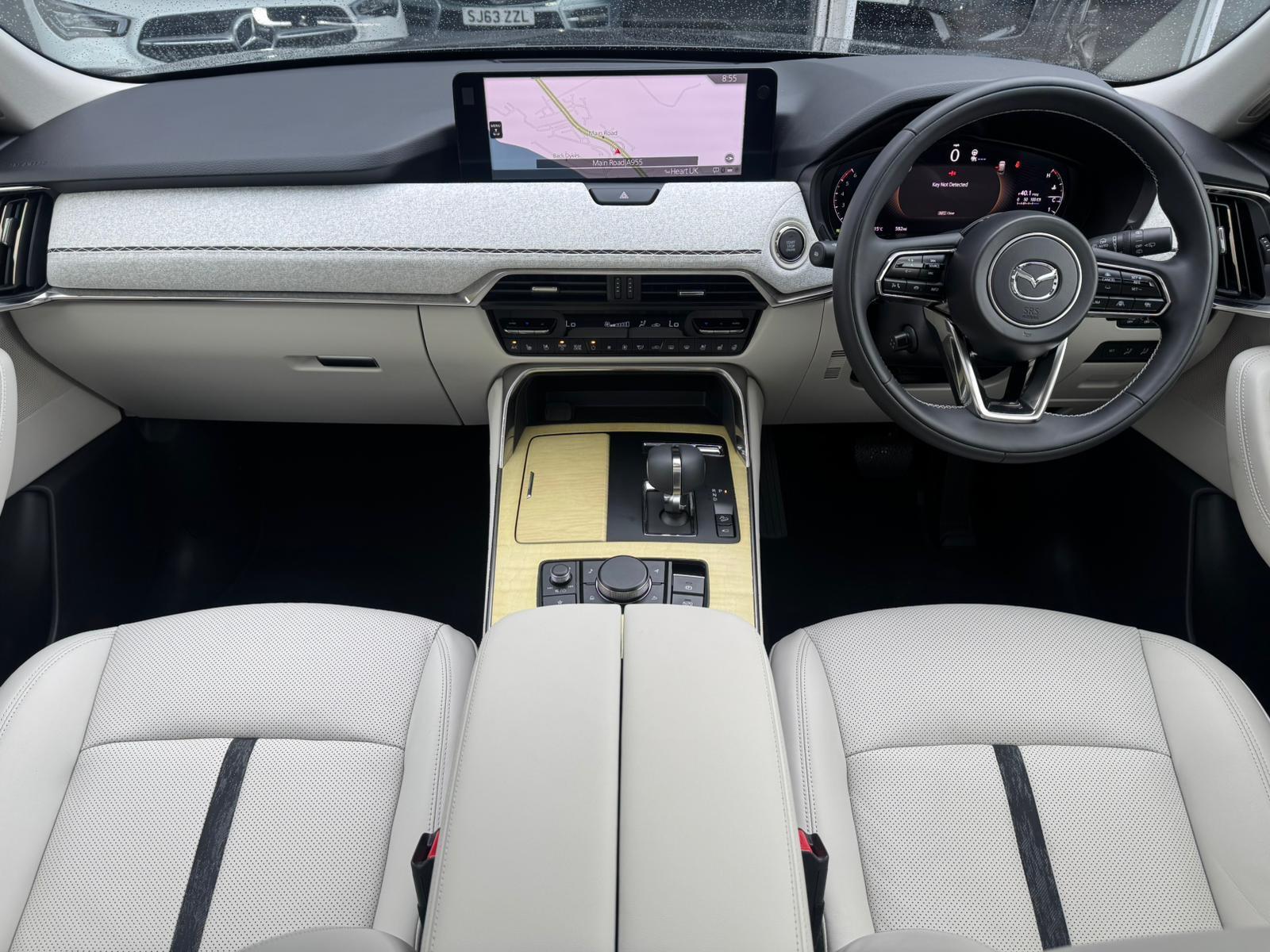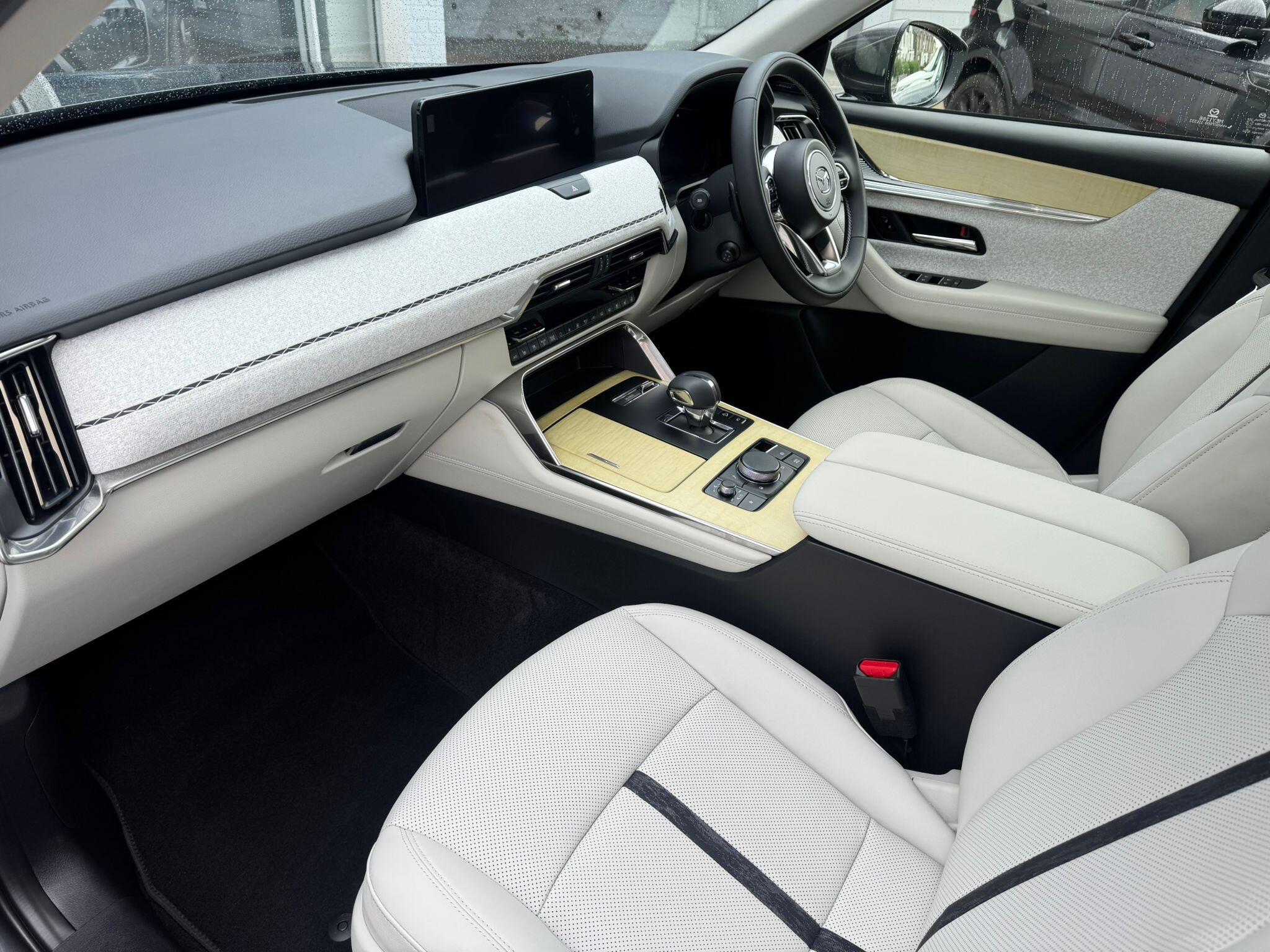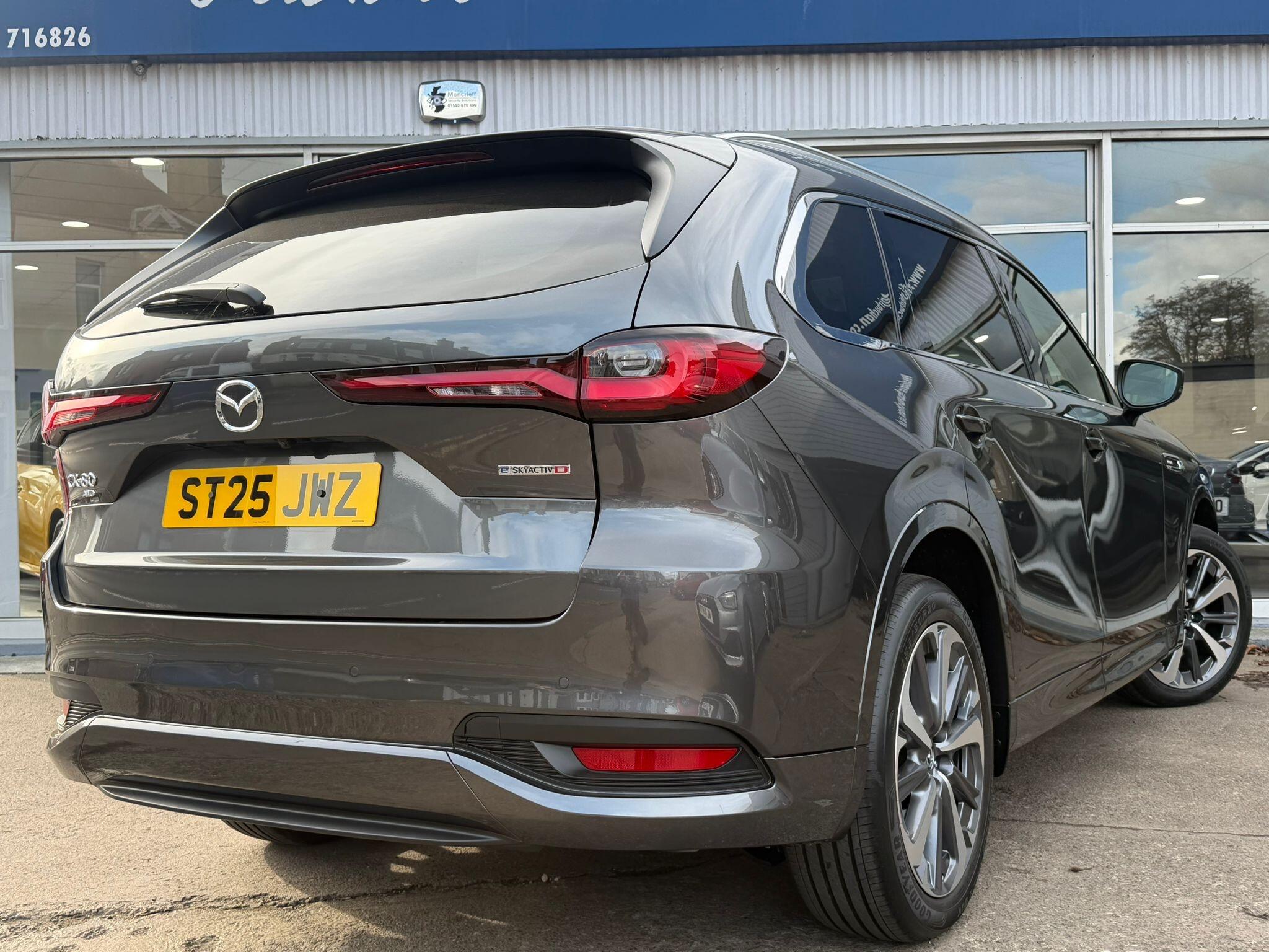 This 2025 Mazda CX-80 e-SKYACTIV D Takumi Plus presents an exceptional ownership opportunity with an incredibly low mileage of just 400 miles. As a single owner vehicle, this Four Wheel Drive model boasts a powerful yet efficient 3.3L Diesel Hybrid Engine, adhering to Euro 6 emissions standards. Inside, you'll find comfortable seating for seven, complemented by Three Zone Climate Control Air Conditioning with dedicated rear air vents for the second and third rows, ensuring everyone stays comfortable. The Takumi Plus trim enhances your driving experience with heated outer rear seats in the second row, a Reversing Camera with Dynamic Lines for easier parking, and advanced safety features like Blind Spot Monitoring with Rear Cross Traffic Alert and Vehicle Exit Warning. Smart Keyless Entry adds to the convenience of this well-appointed SUV.